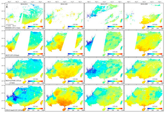 Spatial patterns of daytime 1-km MODIS LST (the first row), 10-km MLP LST (the second row), 1-km MLP-GTWR LSTcor (the third row), and 10-km ERA5-Land LST (the fourth row) on the 14th (the first column), 105th (the second column), 197th (the third column), and 289th (the fourth column) days in 2014. The blank areas indicate the missing MODIS LST due primarily to cloud contamination and the AMSR2 gaps due to its orbit swath.