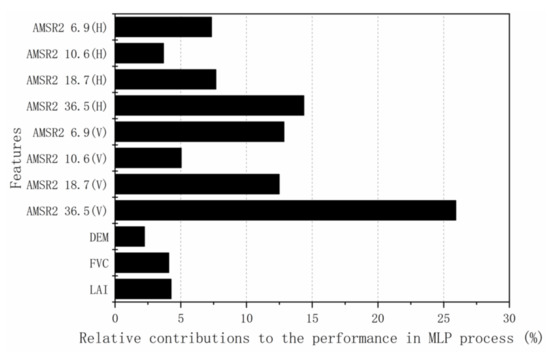 where LSTv denotes the MODIS LST at the training stage and the LST prediction at the predicting stage; BTs represents the AMSR2 BTs of the four channels (6.9, 10.7, 18.7, and 36.5 GHz at both H and V polarization); ancillary data including the LAI, FVC, and DEM are involved to enhance the robustness of prediction; and is the nonlinear function learned by the MLP model.