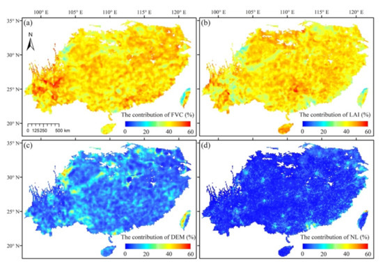 where (ui,vi,ti) denotes the space–time location of a pixel i; β0(ui,vi,ti) is the intercept and β1–β4 are the local coefficients estimated at the pixel i for DEM, LAI, FVC, and NL, respectively; LSTi is the land surface temperature of the pixel i; and εi is the regression residual.