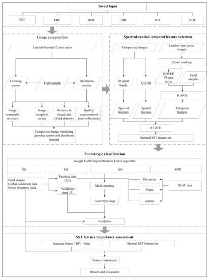 Therefore, the overarching goal of this study was to explore forest type discrimination for large-scale mapping using spectral, spatial, and temporal (SST) features derived from earth observation big data. Through our research, we want to provide a general and reliable forest type classification method and reveal relative SST feature contributions to different geographical areas.