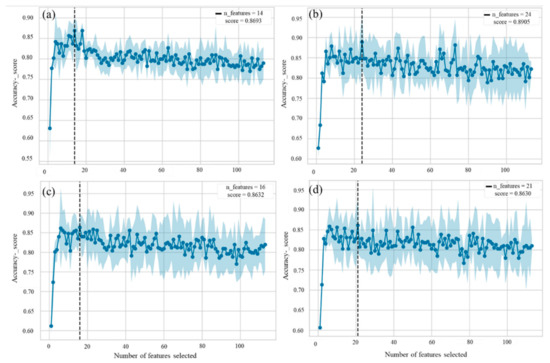 Figure 3b): the best accuracy (0.8905) occurred when the number of features reached 24, and it showed a similar trend to NE, although with different remaining features (