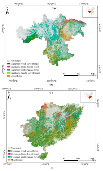 Figure 4c): EBF, ENF, MIF, DBF, and DNF forest types were seen to occur in SO, and were mostly concentrated in the southern and eastern areas of the region, with a forest-cover rate of 57.17%. The amount of EBF accounted for 38.85% of the forest area, followed by MIF and ENF (28.57% and 27.95%, respectively), with DBF covering the smallest area, at 4.63%.