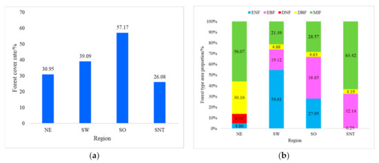 Figure 4a): forest types mainly included MIF, DBF, and DNF, which were mostly distributed around the Daxing’an and Xiaoxing’an Mountains and around Changbai Mountain. It was apparent that the proportion of DNF in NE China was significantly higher than in the other three regions examined, and was distributed in the east and north of the Daxing’an Mountains. This was consistent with the fact that NE China is the largest DNF-producing area nationally [