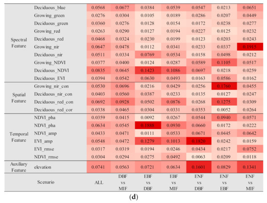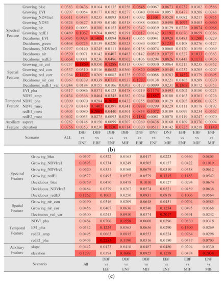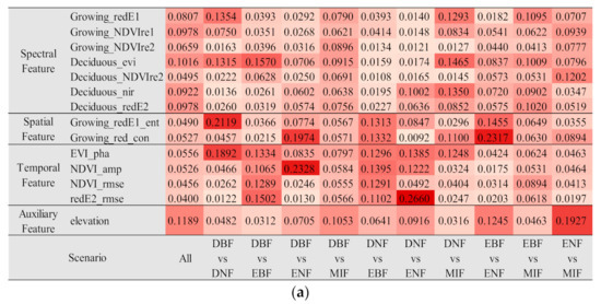 Figure 8), being particularly evident with regard to the classification of evergreen and deciduous forest types with significant differences in growth patterns, where temporal features were found to have major significance.