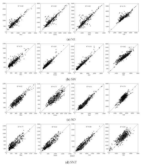 Figure 7. The surface reflectance values in the composite image for the four regions exhibited strong correspondence with the reference images in the blue, green, red, and NIR bands, with R2 values ranging from 0.69–0.93.