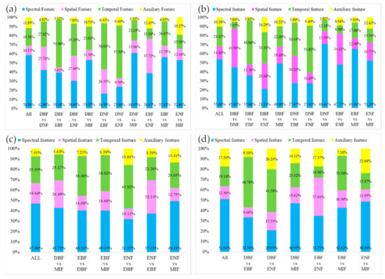 Figure 8) in the four regions, suggesting that spectral features derived from remote sensing images remained the most important in forest type classification processes. We saw that spectral features performed particularly well in classifying complex forest types, such as MIF. The importance of temporal features was second only to spectral features in most scenarios (