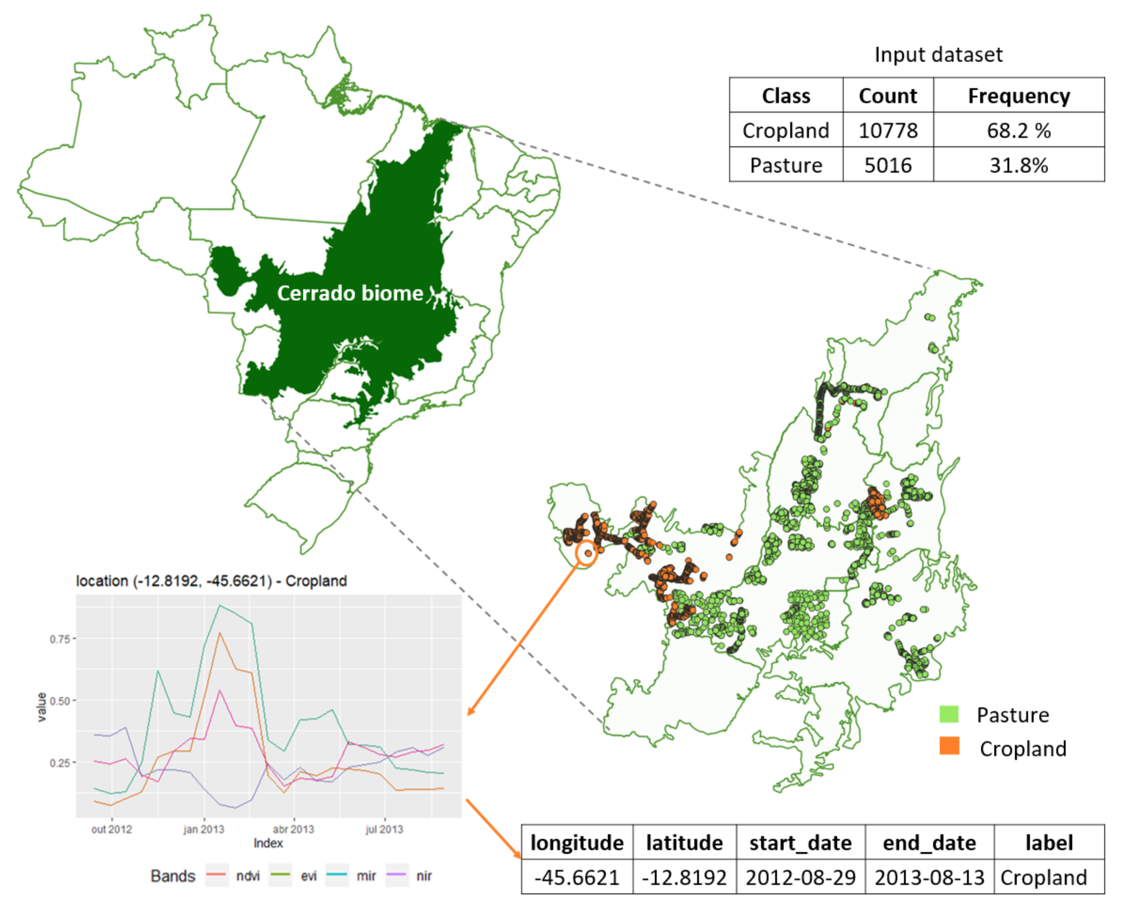 - Cropland 5 represents samples of millet–cotton. In this study, this type of crop is mapped only in the state of Mato Grosso.