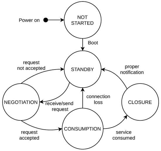 When the provider receives this data packet, it performs the pertinent action associated with the service, such as download or store. When this action is correctly achieved, the provider notifies the customer with an acknowledgment packet. This packet is composed of only the initial seven bytes of the structure presented in Figure 3. Please note that this transmission mechanism follows the stop-and-wait Automatic Repeat-Request (ARQ) procedure. Although this mechanism does not optimize the communications capacity of the connection (i.e., bandwidth-delay product), this process ensures that packet-by-packet the customer is aware of the completion of the service. Furthermore, the provider is always verifying that the amount of data received from the customer does not exceed the negotiated one. If it is the case, the provider would start the closure phase, detailed in Section 2.3.