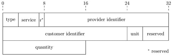 Finally, the fields quantity and unit determines how much of the service is requested. In particular, the three bits of the unit field determines the magnitude of the value represented in the quantity. With this structure, it is possible to request a specific value of a resource associated with a service, such as bytes or time. For instance, a customer that would like to consume the service to store data, it would request to store 10 GB indicating the value 10 in the quantity and the GB unit in the unit field (properly coded). Please note that six bits are reserved for future extensions related to the number of services or unit levels.