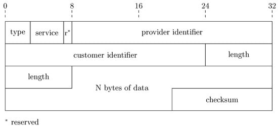At the very beginning of the structure, three bits identify the packet type, being in this case the request one. The provider identifier field is included to select the proper satellite if multiple providers are publishing in the network. The following customer identifier field determines the satellite which is requesting the service. Please note that both identifiers are represented with three bytes, which follows the format defined in []. After identifying the provider and the candidate customer, the type of service is determined with four bits. With this field, it is possible to recognize multiple services from a single provider.