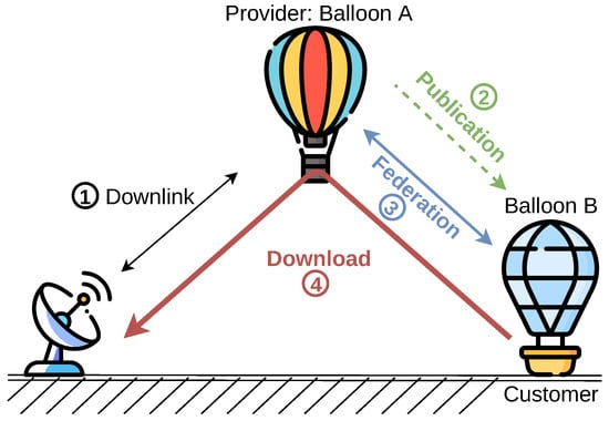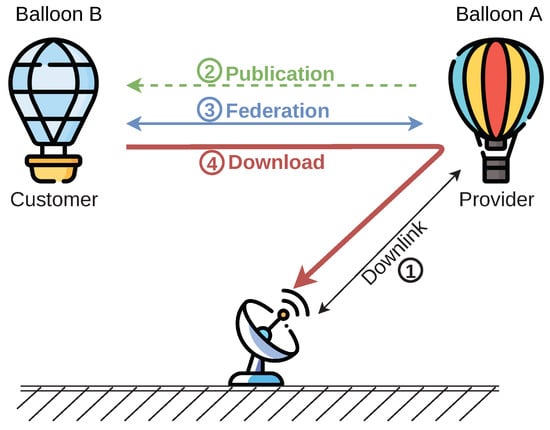 The configuration between the different nodes changed depending on each federation type that was deployed. In the case of the download service, the ground station established downlink contacts with a balloon which were used to download data from other balloons. This sharing of the downlink capacity enabled the retrieval of data from other balloons that were not directly reachable from the ground station. The sequence of actions conducted in this type of federations is represented in Figure 6 and detailed as follows. First, (1) the ground station connects to one of the stratospheric balloons (i.e., Balloon A). After the connection handshake, Balloon A starts to download data until it transfers all the generated packets. At this moment, (2) Balloon A publishes the availability of the downlink contact using the OSADP protocol. This publication is received by another balloon (i.e., Balloon B), which decides to establish a federation. For this reason, (3) Balloon B transmits a request of the service, triggering the negotiation phase of the federation. Once this phase is accepted by Balloon A, the roles of both balloons are defined: being Balloon A as the service provider, and Balloon B as the customer. At this moment, (4) the balloons start the federated phase in which the customer sends its data to the service provider to be downloaded. After the correct download, the service provider notifies the customer of the correct data transfer. This federation remains active until the contact with the ground station ends (i.e., service ending) or until the customer does not need the service anymore. At this moment, the closure phase finishes the connection, and each balloon goes back to its nominal operations (i.e., generating data). As a result, Balloon B has additional downlink opportunities to transmit data to the ground.