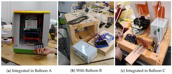 As part of the verification plan of the FeDeCop, a stratospheric balloon campaign was conducted. This campaign was designed to evaluate the performance of the proposed protocols and their flexibility to deploy federations with different services. In particular, the main types of federations that have been deployed were (1) to download data from a balloon to another (i.e., download service), and (2) to balance stored data between balloons (i.e., storage service). Three stratospheric balloons and a ground station were used to test these characteristics of the proposed design. From now on, the balloons are identified as Balloon A, Balloon B, and Balloon C. Each of these balloons was equipped with a model of the FSSExp payload [,], properly integrated for the stratospheric conditions. Figure 5 presents the payload and the subsystems that conform it: (1) the Radio Frequency Inter-Satellite Link (RF-ISL) board, (2) the On-Board Computer (OBC), and (3) the Long Range (LoRa) payload (related to another experiment). The RF-ISL board is a device that is used to establish the needed communications links between the stratospheric balloons, and the downlink contact with the ground station. It provides a half-duplex interface working at 437.35 MHz and 58 kHz of bandwidth. A Gaussian Minimum-Shift keying (GMSK) modulated signal is transmitted with 31.2 dBm of power, and it transports packets coded with Reed-Solomon. Its reception gain is 12.5 dB, and it has a 230 K of system temperature. The transmission rate is 9.6 kbps. Apart from the FSSExp, the balloons were equipped with additional subsystems, such as a battery, a Global Positioning System (GPS) receiver, among others.