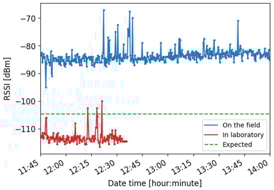 Since the moment that the balloons are released, they start to move away from the ground station, reaching a maximum value of 95 km. The FSSExp payload is designed to establish a communication link between two modules separated up to 400 km. Therefore, the FSSExp payload can communicate with the ground station during the entire flight. However, other aspects may also impact this effective communication range. This communication is feasible only if the Signal-to-Noise Ratio (SNR) of the received signal is greater than the minimum required. In the laboratory, the noise floor measured with the Received Signal Strength Indicator (RSSI) from the FSSExp payload, and connecting a matched load as an antenna was −113.0 dBm (average). Considering the rural area of the launchpad, the expected noise floor should be −104.7 dBm according to the International Telecommunication Union Radiocommunication Sector (ITU-R) recommendations []. However, the noise floor in the launchpad was −85.0 dBm (average), 19.7 dB greater than the expected one. Figure 8 presents the difference between these three noise floors. The blue line corresponds to the measured noise floor, the red line corresponds to the measured noise floor in the laboratory, and the green line corresponds to the estimated one in the launchpad. This increase generates an antenna temperature of 2.9 × 10 K, two orders of magnitude larger than the expected one (i.e., 2900 K). The existence of an interference signal is the cause of this increase. The link budget is thus impacted by reducing the maximum communications range to 55 km, which entails the loss of communication between 13:00 and 13:15.