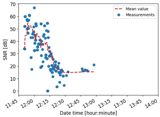 The record of all the sniffed packets in the ground station enables the evaluation of the impact of this separation in the performance of the communications. Figure 10 shows the evolution of the SNR of Balloon A packets, which decrease over time. Before the release of the balloon, the SNR remains around 40 dB. After it takes off, the SNR rapidly goes down until 16 dB (around 12:50). Then, the communications between the balloons and the ground station is lost. Please note that this situation is coherent with the degradation of the link budget due to an interference signal, which determines that the communications should be lost after 13:00.