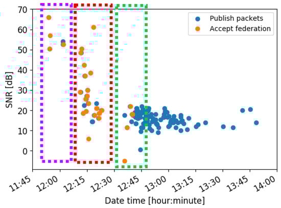 SNR of packets that establish a federation, such as publish (blue dots) and accept (orange dots) packets. The three regions are remarked with dashed boxes.