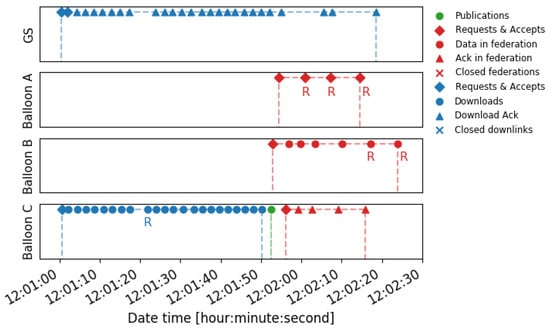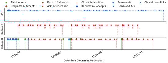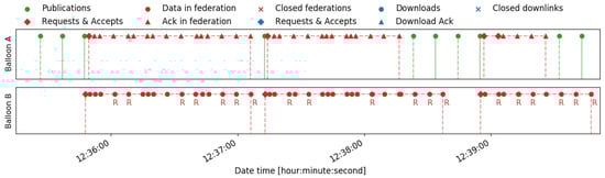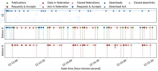 When the balloons are still on the ground, multiple federations were established to verify the correct operation of the payloads. Among all of them, Figure 12 presents the packet sequence of a federation. This sequence represents the different packets exchanged between the balloons and the ground station scheduled on time. Moreover, this representation identifies the types of packets using different colors and shape markers. For instance, all the blue markers correspond to packets exchanged in a downlink connection, while the red markers identify those exchanged in a federation. The rhombus (⋄) and the times (×) markers represent respectively the packets to establish and close a connection (i.e., a downlink or a federation). In the case of a federation, these are the request, the accept, and the close packets. The dot (∘) and the triangle (△) markers correspond respectively to data and acknowledgment packets. Moreover, the packet that corresponds to a retransmission is represented with an “R” below the marker. Finally, the green markers correspond to publications of the service. This kind of representation helps to understand the periods when a downlink or a federation is established with a dashed line of the corresponding color.
