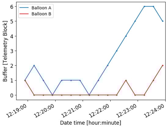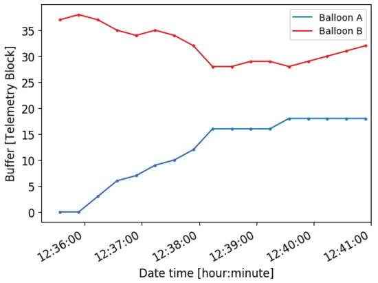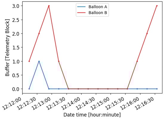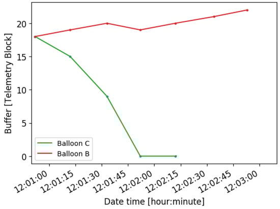 Up to four federation packets are downloaded from Balloon B during the federation. Figure 13 presents the memory usage of Balloon B and Balloon C. Please note that the buffer usage is measured every 20 s in each balloon. When Balloon C establishes the downlink connection, it reduces the usage to zero by directly downloading them to the ground station. When the federation is established, Balloon B reduces its usage by using the federation. Once the federation is closed, Balloon B keeps producing new data packets and thus increasing the usage of the buffer.