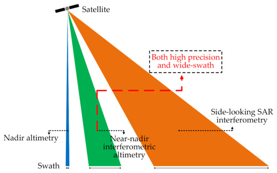 Sea surface height (SSH) has received unprecedented attention due to the significant application value in understanding the ocean dynamics, such as currents, eddies, fronts, and turbulence [1]. Spaceborne radar altimetry was proposed in the 1960s and has the ability to measure the SSH with global and frequent high precision [2]. These powerful remote sensing observations of SSH allow us to better monitor the ocean dynamics and make better use of the Earth’s resources. Moreover, the global mean sea level (GMSL) can be effectively calculated by satellite altimetry, and this will also have a large impact on the climate change debate [3,4]. Benefiting from the previous successive missions, namely, the TOPEX/Poseidon, CryoSat-2, Sentinel-3A, and Jason series, the forthcoming Jason-CS, also called Sentinel-6A, will achieve the altimetric accuracy of ~2 cm or better [5]. However, conventional nadir altimeters, such as the operational Jason-3 or HY-2A/B/C, have a restriction on spatial resolution strongly related to the latitude and only measure a two-dimensional ocean surface topography (OST) larger than ~ 100 km [6]. For satellite ocean altimetry, the spatial resolution unit could be largely divided into three ascensive phases, namely, the “diamond”, the “grid”, and the “pixel” phases [7]. Monitoring the OST with centimetric accuracy based on a finer spatial resolution as “pixel” is of great significance to characterize the ocean sub-mesoscale processes and has become a crucial task for ocean scientific research in recent years [8]. Additionally, the calculation of the GMSL change can also benefit from such finer spatial resolution [9]. As shown in Figure 1 with the green beam, the interferometric radar altimeter (IRA), which inherits the advantages of both nadir altimetry and the side-look synthetic aperture radar (SAR) interferometry, is capable of measuring ocean variabilities at smaller scales [10]. The IRA is essentially a near-nadir interferometric SAR (InSAR) sensor that can monitor the ocean short-scale processes with high accuracy and is expected to be the next generation of satellite altimetry payload.
