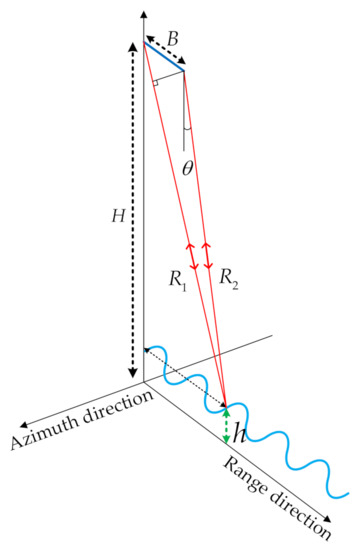 To characterize the altimetric errors due to the dynamic waves, the interference principle of InSAR is introduced first. The interferometric measurement concept could be approximately simplified as triangulation in Figure 2.