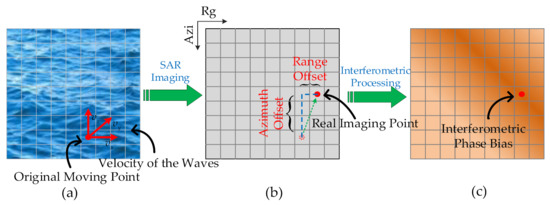 Schematic diagram of the MB in InSAR altimetry. (a) Real ocean scene with dynamic waves; (b) SAR image with the offsets of the point; (c) interferometric phase bias and final lead to height bias.
