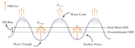 With regard to the influence of EMB on InSAR two-dimensional SSH measurement, different areas of the sea surface have different scattering intensity of EM waves. Due to the hydrodynamic modulation effects, the scattering intensity of wave troughs is greater than that of waves as , shown in Figure 5, which will have a weighting or modulation effect on the dynamic effects of the waves.