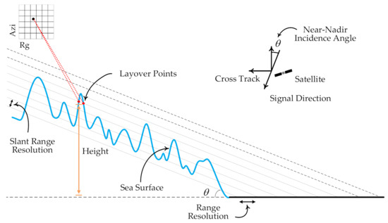 where ⟨ ⟩ means the spatial average. At this time, the coupling of MB and EMB is included in Equation (12), and this provides a method for the consideration of InSAR EMB. Additionally, it is different from nadir altimeters; InSAR works in side-looking mode, and this causes intrinsic geometric distortions, such as foreshortening, shadow, or layover phenomena [34]. Because of the small incidence angle at near-nadir, the layover effect for InSAR SSH measurement is severe and cannot be ignored for high-accuracy requirement.