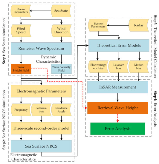 The analytical method flowchart proposed in this study is shown in Figure 7, where four necessary steps are involved. In the first step, the wave spectrum is used with the information of the sea states (including wind speed and wind direction). Then, the wave height field and wave velocity field due to the winds can be calculated by the spectrum decomposition. In the second step, based on the EM parameters of the InSAR, the two-dimensional ocean surface NRCS can be calculated by using a three-scale second-order sea surface scattering model. In the third step, the measurement errors are calculated based on the theoretical models; both EM characteristics and dynamic characteristics are taken into consideration, including MB, EMB, and LB. After the above three steps, based on the InSAR measurement geometry, the SSH can be retrieved with the impact of dynamic surface waves. By comparing the real wave height calculated by the wave spectrum, the dynamic wave-related altimetric errors can be characterized, and the analysis can be conducted. It should be noted that to better characterize the errors due to the dynamic waves, the rest of the system errors; random errors; and propagation errors, such as the baseline vibration, the orbit change, or the path delay, are ignored in our simulation.