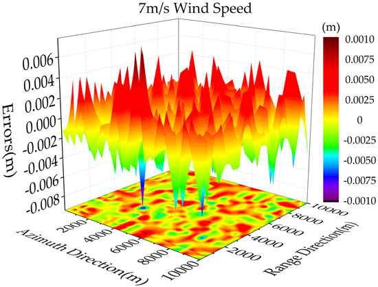 Figure 10 is the three-dimensional distribution of the dynamic wave-related errors for InSAR altimetry based on the above-mentioned parameters of SWOT. As we can see, under the resolution of the 0.5 km2 grid, the level of the errors under low sea states is relatively smaller. By statistical analysis, the RMSE can be calculated as shown in Table 2. The RMSE based on the proposed method is 0.2486 cm; meanwhile, the RMSE introduced by wave motion given by NASA for SWOT is 0.2470 cm [11]. The results of the two experiments are well-matched, indicating the correctness and reliability of our analytical method. At the same time, the small difference may be that we consider the coupling of EMB and LB from the waves in our experiment. This also makes the simulation results closer to the actual InSAR stochastic ocean measurement scenarios.
