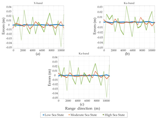Comparisons of the dynamic wave-related errors of InSAR altimetry along the range direction under different sea states: (a) X-band; (b) Ku-band; (c) Ka-band.