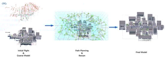 UAV-based 3D scanning is typically performed either under manual control or automated navigation operation; however, neither can fully satisfy the requirement of achieving complete coverage for urban scenes. On the one hand, simultaneous manipulation of the motion and viewing direction of a UAV is highly challenging, even for experienced drone pilots. Furthermore, human factors can easily lead to UAV accidents in complex urban scenes. On the other hand, existing commercial flight planning applications, such as Pix4Dcapture (https://www.pix4d.com/product/pix4dcapture/ (accessed on 1 March 2021)) and DJI Flight Planner (https://www.djiflightplanner.com (accessed on 1 March 2021)), generally choose pre-defined flight patterns (e.g., grid, zigzag, or circular trajectory) at a safe overhead distance, with the camera pointing in a default direction. However, the use of such software, in many cases, leads to incomplete reconstructions due to important information not being captured (e.g., due to occlusions by walls or convex structures). More specifically, due to the huge computational burden and long process of the reconstruction, it is often impractical to find and rescan the incomplete regions immediately.