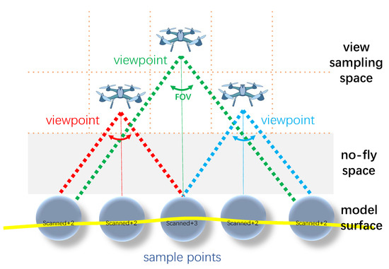 Global viewpoint. When the local viewpoint set has been determined, we compute the coverage range of these viewpoints. For each viewpoint in , the coverage range can be calculated according to the FoV of the camera and the distance between and its corresponding sample point . To simplify the calculation, we add the “scanned” mark by 1 for all sample points in the neighborhood of with the Euclidean distance smaller than .