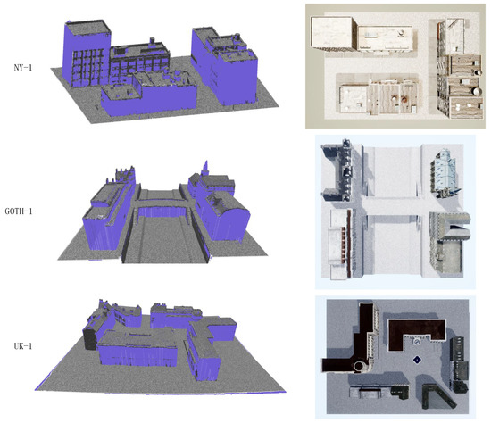 Overview of the thrual scenes (NY-1, GOTH-1, and UK-1) from the benchmark of [28]. Note that the proxy models (left) are provided by the benchmark. The pictures on the (right) are captured from the top of the virtual scenes.