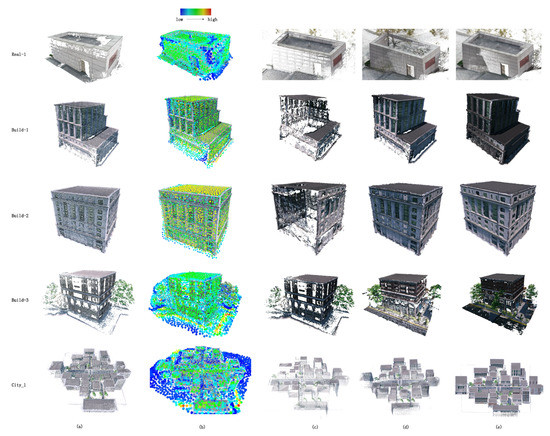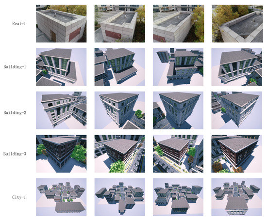 In order to conduct a comparison with the pre-defined flight paths commonly used by commercial software, we captured different sequences ual and real urban scenes. Specifically, we controlled the virtual camera in Unreal4 to scan the virtual scene “Urban City” (https://www.unrealengine.com/marketplace/product/urban-city (accessed on 1 March 2021)), a fully realized urban city environment, following the simulated pre-defined path and the path optimized by our method, respectively. We captured the virtual scene at different scales, including three small (Building-1, Building-2, and Building-3) and one large (City-1) captures. We also used a DJI Phantom 4 Pro to capture aerial photos from the real scene. Figure 5 shows an overview and the basic information about all of the scenes. We can see that the three selected buildings had typical characteristics: Building-1 was a two-story structure, where the lower layer was easy to scan insufficiently; Building-2 was a more symmetrical rectangular structure, but nearby buildings were more likely to cause occlusions; and there were some trees around Building-3, which could cause occlusions.