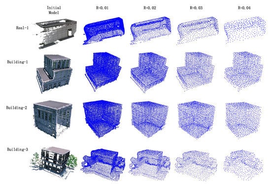 As mentioned in Section 3, we used the sample radius R to control the number of sample points and the division of voxels for candidate viewpoints. In order to adapt to models with different scales, R is set to the given percentage of the longest axis of the bounding box in practice. Figure 6 shows some examples of the sampling for the self-collected data sets, where the density of sample points directly corresponds to R. It is worth noting that all sample points were evenly distributed on the models, including those in incomplete areas; thus, planning a 3D trajectory that fully scans the entire scene based on sample points is theoretically feasible.