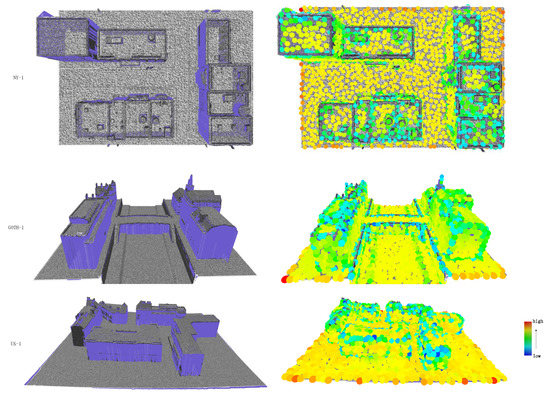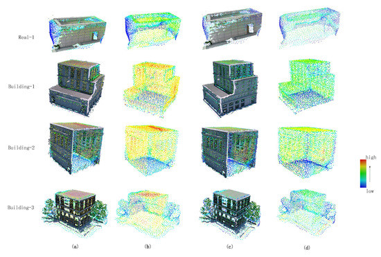 Visualization of the quality evaluation on the four scenes of self-collected data sets: (a) Initial coarse models and sample points, colored according to the completeness score on the surface; (b) Sample points, colored according to the completeness score; (c) Initial coarse models and sample points, colored according to the smoothness score on the surface; and (d) Sample points, colored according to the smoothness score.