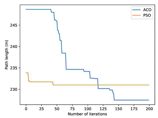 Path planning. After the viewpoints were determined, we formulated the problem of path planning into a TSP, which is NP-hard. We chose the ACO algorithm to solve this problem, which is more effective than exhaustive search methods. As shown in Table 2, we randomly selected viewpoints from the flight path of the NY-1 scene, compared the time cost, and evaluated the shortest path length between the ACO algorithm and the Branch and Bound (BnB) method. It can be seen that, when the number of viewpoints increased, the computational cost of the BnB algorithm increased sharply, while the computational cost of the ACO algorithm increased slowly. Both algorithms obtained the same optimal solution. We also compared the ACO algorithm with the Particle Swarm Optimization (PSO) algorithm, as shown in Table 3, from which we can notice that, although the PSO algorithm is much faster when the number of viewpoints was larger, the ACO algorithm was relatively robust. It is worth noting that the comparison was implemented in a single thread and, thus, parallel calculations can be used to improve the calculation speed in practice. In addition, Figure 9 shows the comparison of the convergence performance using 50 viewpoints. It can be seen that the PSO algorithm can converge quickly, but it is also easier to fall into the local optimum.