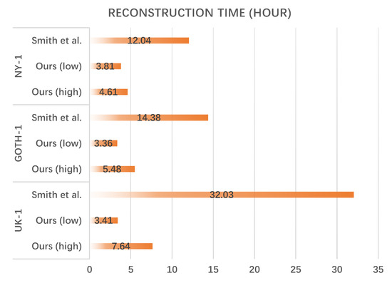 Table 4 provides the quantitative evaluation of the final reconstruction. For each scene, we also simulated the grid acquisition path of the commercial flight software. It is worth noting that the number of images refers to the final reconstruction, and the coarse models were all acquired from the released file of the benchmark [28]. Compared to [28], our approach achieved comparable reconstruction results, in terms of both error and completeness statistics, with fewer images. More importantly, as shown in Figure 11, the total time cost of our approach for scene reconstruction was significantly less than [28].