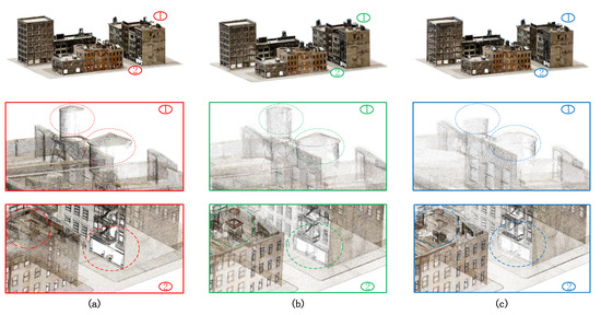 Figure 12 visualizes the final reconstruction comparison of the NY-1 scene, including the entire point clouds and zoomed-in views of detailed regions. Column (a) visualizes the recovered point cloud from the captured 433 images using the released trajectory of [28]. We can observe that some convex structures and easily occluded areas were incomplete in their model (see, e.g., the towers on the roof and the wall under the stairs). As shown in columns (b) and (c), by emphasizing non-smooth area scanning, our method was able to fully rescan these regions and make the reconstructions more complete, even with fewer images captured and sparser points recovered.
