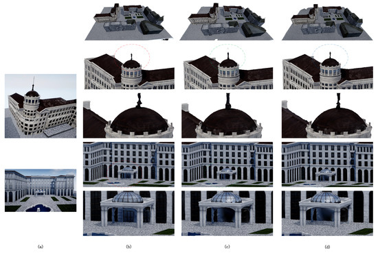 Comparison between the state-of-the-art approach [28] (b) and our method (c,d) on the virtual scene UK-1: (a) Corresponding aerial photos of the scene; (b) Mesh model recovered by the state-of-the-art [28] using 923 images; (c) Reconstructed mesh model of our method using 362 captured images from the ‘high’ trajectory; and (d) Recovered mesh model of our method using 203 captured images from the ‘low’ trajectory. The zoomed-in comparison shows that the final reconstruction quality of our ‘high’ trajectory and the state-of-the-art was very close, but their method required more than twice as many pictures as ours.