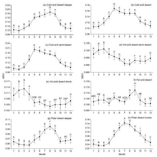 Variation of mean monthly normalized difference vegetation index (NDVI) in different desert areas over the Silk Road Economic Belt between 1982 and 2015. Different uppercase letters indicate significant differences between different months at p < 0.05. (a–h) indicate different desert areas, respectively.