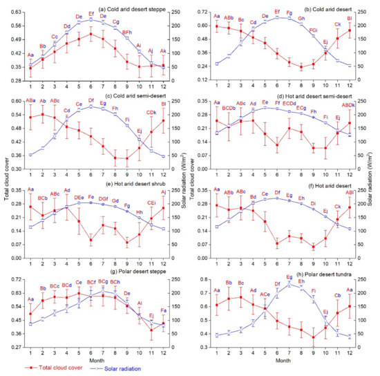 Variation of mean monthly total cloud cover and solar radiation in different desert areas over the Silk Road Economic Belt between 1982 and 2015. Different red uppercase letters indicate significant differences in total cloud cover between different months at p < 0.05, and different blue lowercase letters indicate significant differences in solar radiation between different months at p < 0.05. (a–h) indicate different desert areas, respectively.