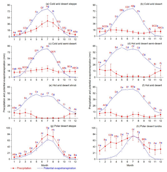 Variation of mean monthly precipitation and potential evapotranspiration in different desert areas over the Silk Road Economic Belt between 1982 and 2015. Different red uppercase letters indicate significant differences in precipitation between different months at p < 0.05, and different blue lowercase letters indicate significant differences in potential evapotranspiration between different months at p < 0.05. (a–h) indicate different desert areas, respectively.