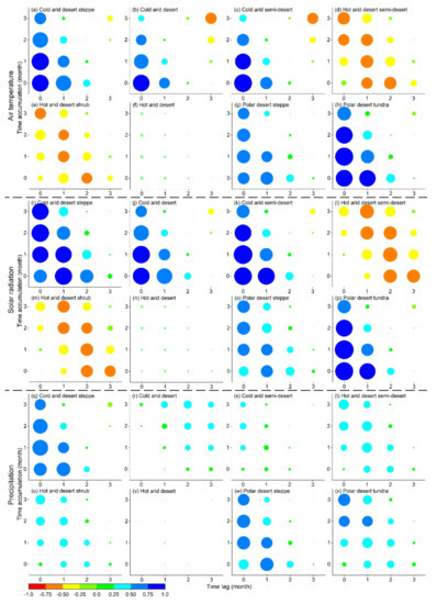 According to the coefficient of determination in most desert areas, the scenario considering time-lag and time-accumulation effects was better than that without considering time effects (Figure 6 and Figure 7). In cold arid areas, air temperature exhibited no obvious time-lag or time-accumulation effect on NDVI, and solar radiation presented 1–2 month accumulation effect. Moreover, the correlation between NDVI and precipitation was relatively low in cold arid areas, with 1–2 month accumulation effect in the cold arid desert steppe area and the cold arid semi-desert area, and 2 month lag and 3 month accumulation effect in the cold arid desert area, respectively. In the hot arid desert semi-desert area and the hot arid desert shrub area, the NDVI showed negative correlation with both the air temperature and the solar radiation, indicating that high temperature and strong radiation may increase evapotranspiration and, thus, drought, further inhibiting vegetation growth. Precipitation showed no remarkable time-lag, but a 3 month accumulation effect on NDVI in these two desert areas. It is noteworthy that NDVI had very low correlation with all three climatic factors in the hot arid desert area, implying complex interactions between vegetation dynamics and environmental conditions here. In polar areas, both air temperature and solar radiation exhibited a 1–2 month accumulation effect on NDVI, while precipitation emerged 1 month lag and 3 month accumulation effect in the polar desert steppe area and the polar desert tundra area, respectively. In summary, the climatic conditions have obvious time effects on vegetation dynamics over the Silk Road Economic Belt, and the time-accumulation effect was more remarkable than the time-lag effect.
