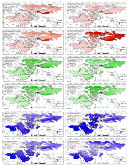 For different seasons, vegetation dynamics in spring were primarily limited by the water, temperature, and cloudiness factors over 89.6, 9.4, and 1.0% of the study region, respectively. Both the northern Qinghai-Tibet plateau and Tajikistan were dominantly restricted by the temperature conditions, while most other areas were constrained by the water conditions (Figure 9 and Figure 10). In summer, the limitation area mainly by the water, temperature, and cloudiness factors accounted for 93.9, 2.1, and 4.0% of the study region, respectively. The restraint degree of the temperature conditions decreased, but the corresponding value of the cloudiness increased in the northern Qinghai-Tibet plateau; while the water constraint increased in the high-latitude areas. In autumn, the percentages of limitation area by different climatic factors were similar as those in spring, but the temperature limitation in the high latitude areas was stronger than that in spring. In winter, the area dominantly constrained by the water, temperature, and cloudiness factors was 41.9, 51.8, and 6.3%, respectively. The areas con-constrained by the water and temperature conditions spread rapidly, including Mongolia, north of China, Kazakhstan, etc. In general, the hot arid areas were always limited by the water condition in different seasons, the polar areas were always constrained by the temperature condition, and the cold arid areas were simultaneously restricted by the water and temperature conditions with different limitation degree in varied seasons.