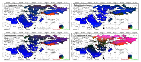 Distribution of combined climatic constraint on vegetation dynamics in different seasons over the Silk Road Economic Belt between 1982 and 2015. Red, green, and blue represent the maximum limits of temperature, cloudiness, and water, respectively, and their combining produce magenta (temperature and water), yellow (temperature and cloudiness), and cyan (water and cloudiness). (a–d) indicate the combined constraint of temperature, cloudiness, and water on vegetation dynamics in spring, summer, autumn, and winter, respectively.