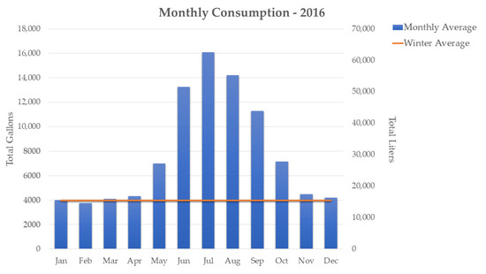 where Cs refers to total summer consumption (indoor and outdoor), Cw refers to winter consumption (indoor) and Co is the resulting summer outdoor consumption. JunT, JulT, and AugT denote the total gallons/liters used in June, July and August, while DecT, JanT, and FebT denote the total gallons/liters used in December, January and February. Cw represents indoor consumption because we assumed that no one waters outdoor landscapes in Colorado during the winter months. Across all households, the average winter indoor use was approximately 4000 gallons (15,000 L)/month (Figure 1) and the average summer use was approximately 14,000 gallons (53,000 L)/month.