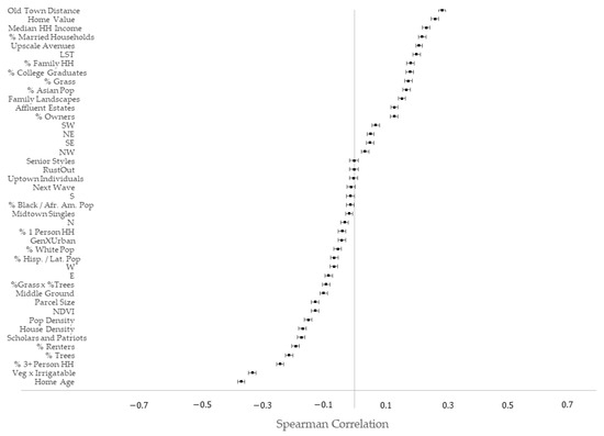 Social-demographic data, as well as house density, were provided by the US Census Bureau’s American Community 5-Year Survey program [13] for 2016. Based on previous studies [11,12,14,15,16], we chose predictor variables that describe features such as ethnicity, tenure, household size, income and educational attainment (Table 2). These data were provided at a block group scale, which consists of several census blocks within the same census tract. Since we were unable to attain parcel-scale data, we disaggregated the broader-scale census block group data to estimate the social characteristics of each household. In doing so, we made assumptions about the social structure of each household, which does not necessarily depict its true condition.