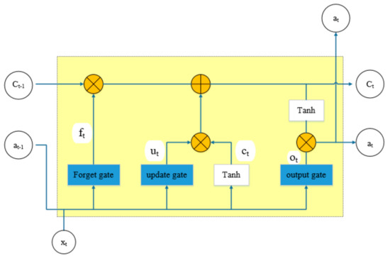 Long Short Time Memory (LSTM) was proposed by Hochreiter and Schmidhuber in 1997 [23]. The LSTM can learn information through a well-designed structure called a “gate”. The gate can store and control the flow of information so that the state of the previous time step can be transferred to the next time step. The LSTM algorithm has three gates—update gate, forget gate, and output gate—to protect and control the cell state explosion in training [25]. The internal structure of the unit memory is as shown in Figure 1.