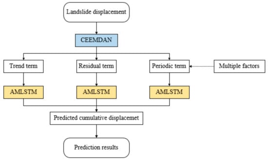 The architecture of the Complete Ensemble Empirical Mode Decomposition with Adaptive Noise (CEEMDAN)-AMLSTM model for landslide displacement prediction.