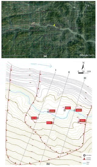 (a) Location map from Google Earth and (b) Locations of the monitoring Global Navigation Satellite System (GNSS) stations on the landslide.